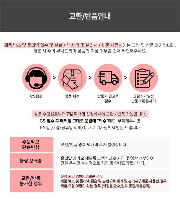· 교환/반품 신청은 배송완료 후 7일 이내에 가능합니다.